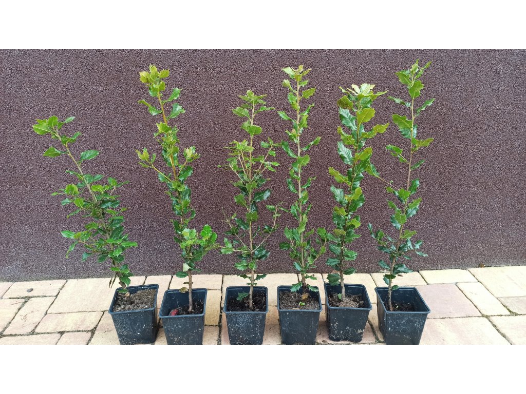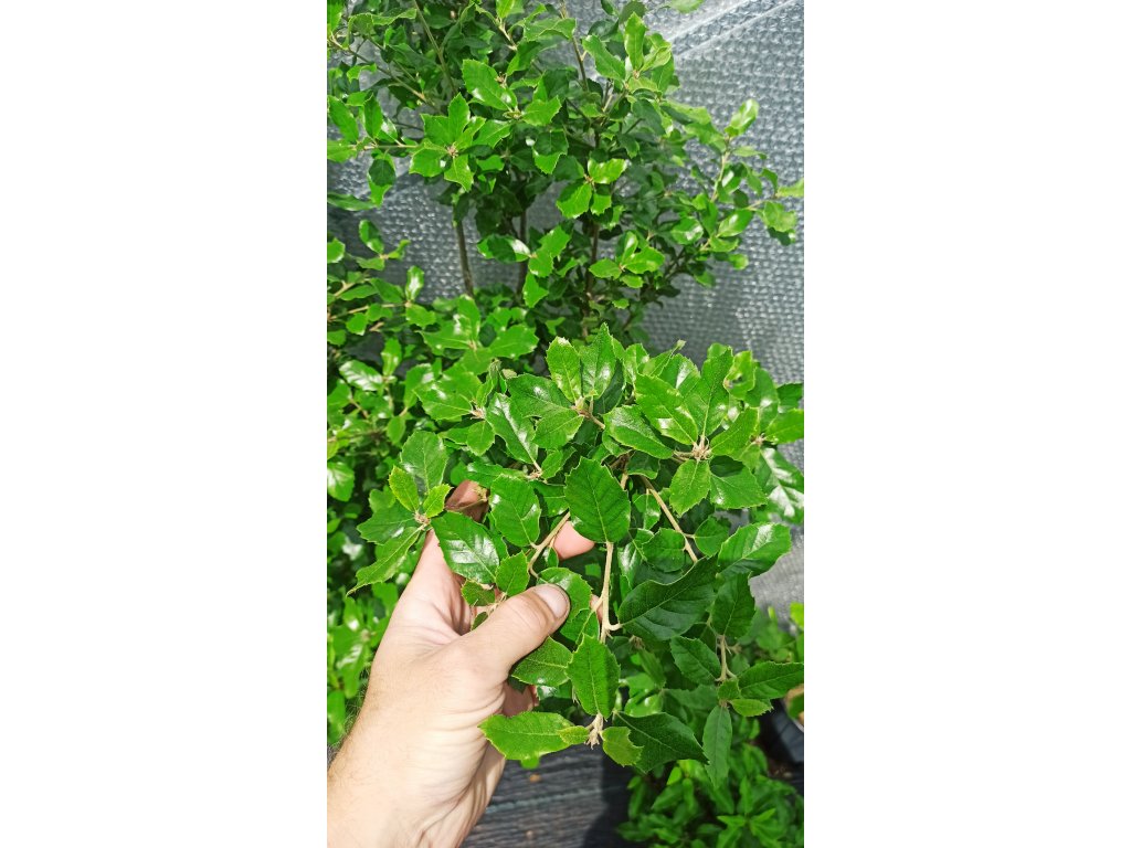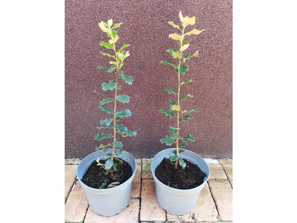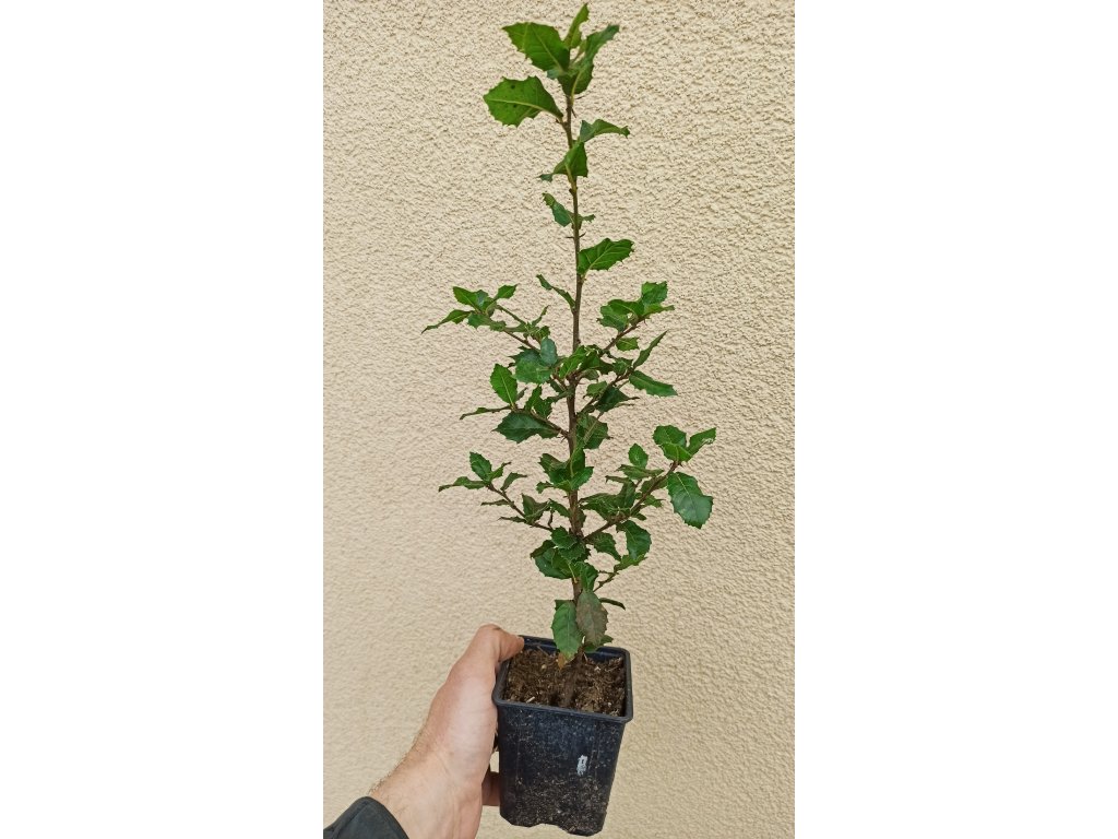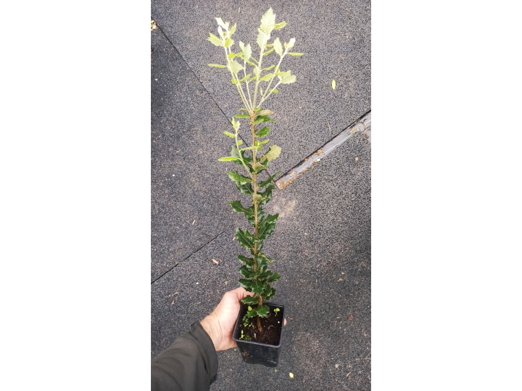 Stálezelený a mrazuvzdorný druh dubu vyskytující se přirozeně ve Středomoří, kde tvoří součást macchie. Je velmi zajímavý svými listy, které jsou téměř k nerozeznání od cesmíny, odtud jeho název. Je překvapivě velmi odolný, snáší bez problémů teploty pod -20°C, uvádí se dokonce až -27°C. Je možné ho tedy pěstovat vysazený na venkovním stanovišti. Potřebuje jen dobře propustný substrát, ve kterém se hlavně přes zimu nebude dlouho držet voda. Ideální je chráněné stanoviště. Pro jeho krásu ho lze pěstovat i v nádobě například na terase se zimním uskladněním do chladného světlého prostoru. Možností je také vytvoření živého plotu. U nás dorůstá do výšky cca 2 metry.