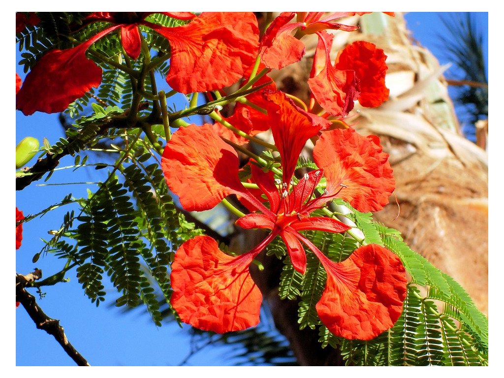 Jeden z nejkrásnějších kvetoucích stromů světa původem z Madagaskaru. V našich podmínkách se dá pěstovat jako přenosná kbelíková rostlina, přes léto ji můžeme mít na zahradě, na zimu v zimní zahradě, případně v místnosti. Zimní teploty by dlouhodobě neměly klesat pod 10°C, krátkodobě snese i teploty kolem 0°C. Jedná se o listnatý strom, listy jsou zpeřené 20 - 50 cm dlouhé, připomínají listy kapradin, květy jsou nápadně šarlatově červené až 10 cm velké. Půda by měla být dobře propustná, stanoviště přes léto slunné až polostinné, chráněné před větrem. Během vegetační sezóny zaléváme pravidelně, přes zimu je nutné zálivku omezit.