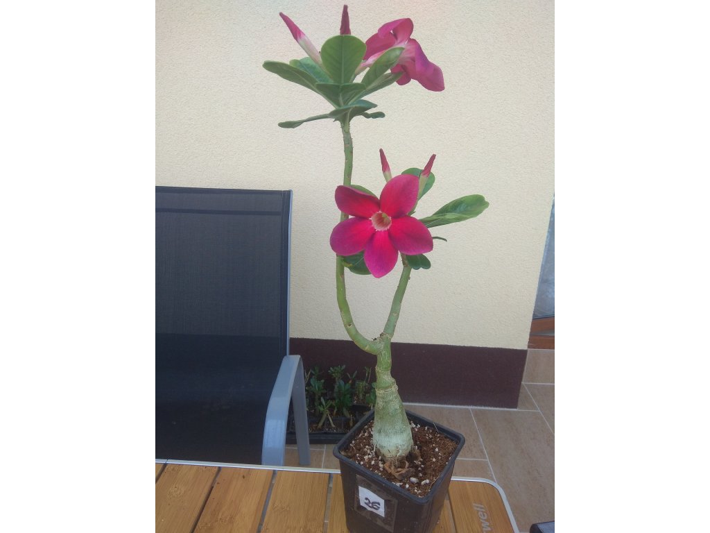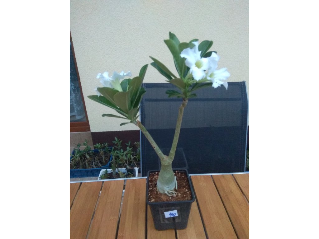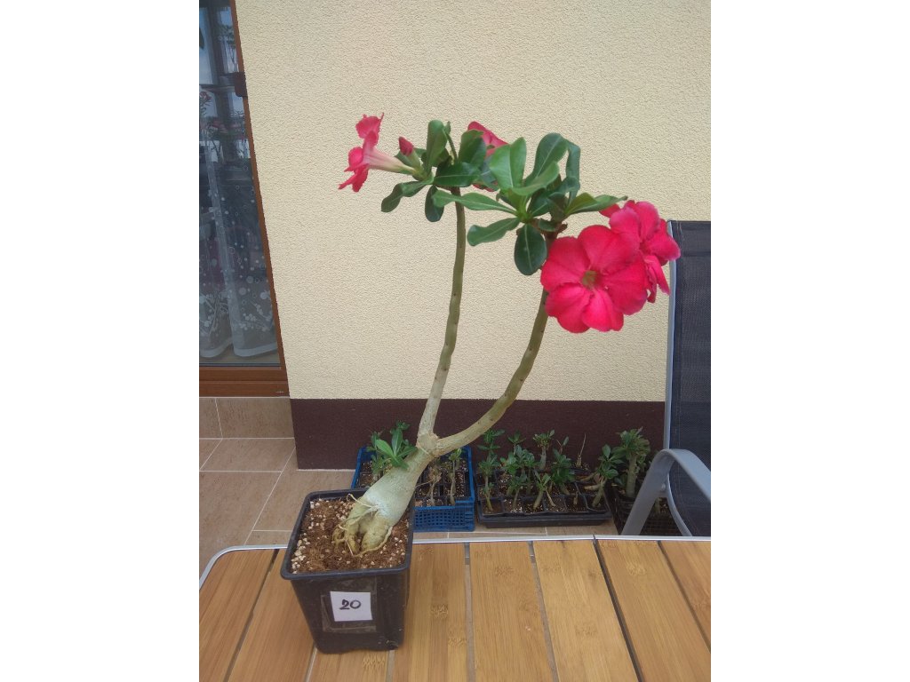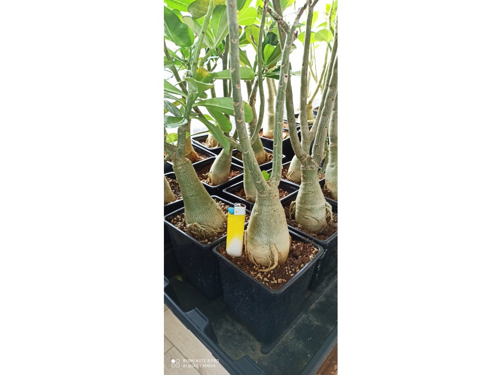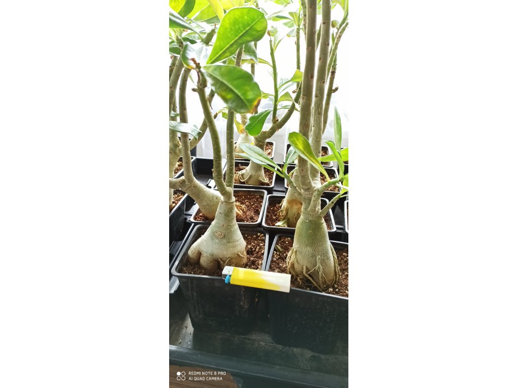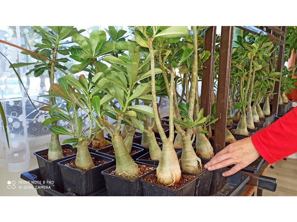 Velké silné roubované pouštní růže v mixu barev. Průměr kaudexu je 8 cm a rostliny mají výšku od 30 do 50 cm. Adenium je sukulentní rostlina z Afriky, dnes pěstovaná a šlechtěná hlavně v JV Asii. Rostliny pěstované ze semen tvoří ztloustlý kmínek (kaudex), díky kterému se adenia výborně hodí na tvorbu bonsají. Jejich jedinou nevýhodou je rostlinné mléko (latex), které je jedovaté, při normálním pěstování a manipulaci však nehrozí žádné nebezpečí. Pěstování je podobné jako u všech kaktusů a sukulentů - propustný substrát, slunce nebo polostín, pokojová teplota, od listopadu do ledna vůbec nezalévat, přes léto možno rosit. V klasických vytápěných bytech se Adeniu daří a dobře kvete od jara do podzimu. Přes zimu adenia shazují většinu listí, také kaudex se může zcvrknout vlivem ztráty vody v rostlině. Po přesazení cca 10 dní nezalévat.